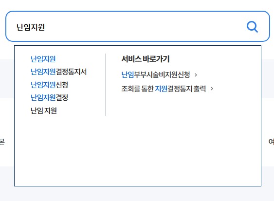 로그인 후 검색창에 난임지원만 검색하면 아래에 사진처럼 서비스 바로가기에 난임부부시술지비지원신청으로 들어가면 됩니다.
