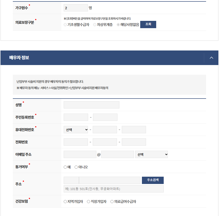 다음으로 넘어가면 가구원수 의료보장구분을 조회하면 자동으로 선택이 됩니다.