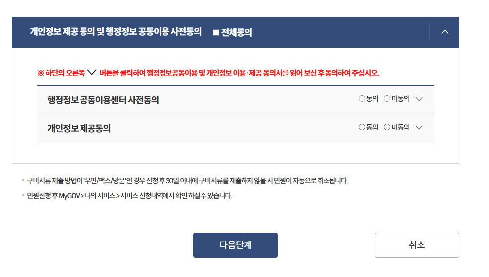 개인정보 제공 동의 후 다음단계 클릭