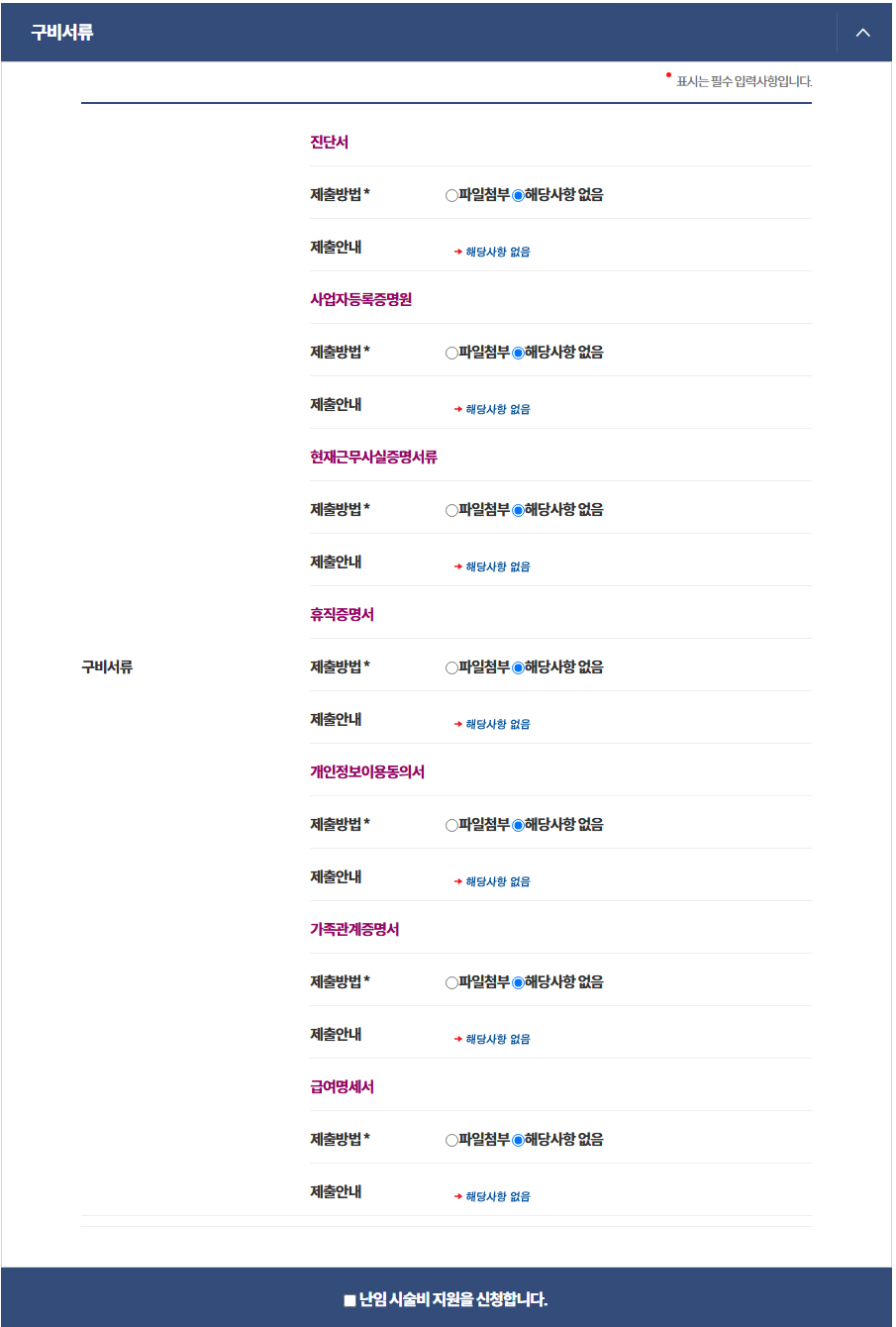 그리고 아래에 배우자 정보를 입력하고 보건소 선택과 시술 종류를 선택합니다. 다입력후 다음 단계로 넘어가면 구비서류가 있습니다. 저는 전에 지원받은 자료가 있어서 구비서류가 필요 없었고 난임지원 신청에 체크 후 민원지원을 신청하면 끝입니다.