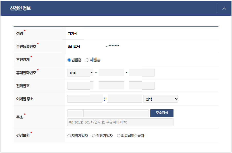 신청내역이 이렇게 나옵니다. 그 후 아래에 혼인관계와 전화번호, 주소, 건강보험 가입정보를 선택하시면 됩니다.